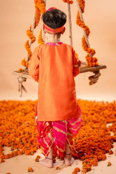 Orange kurta featuring floral motifs with zardozi, beads, and sequin embroidery. Paired with a pink kota dori dhoti pant and mukut.