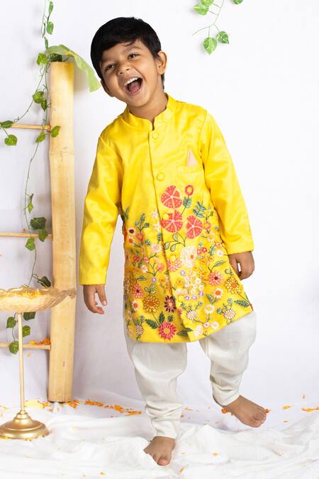 Yellow Organza, Cotton Embroidery Floral Garden Sherwani With Pant