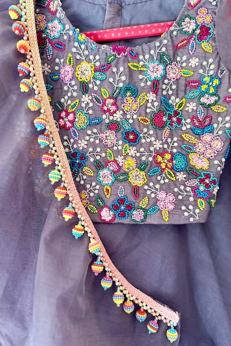 Purple Organza, Cotton, Silk Embroidery, Beads Hand Blouse Lehenga Set