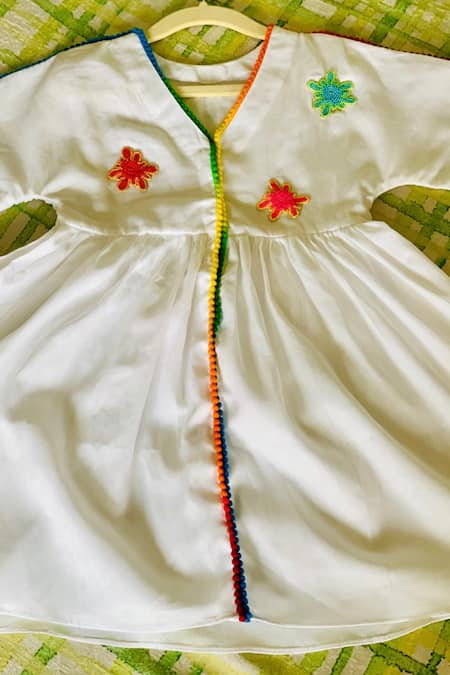 White Cotton Beads, Pom-poms Holi Splash Embroidered Dress