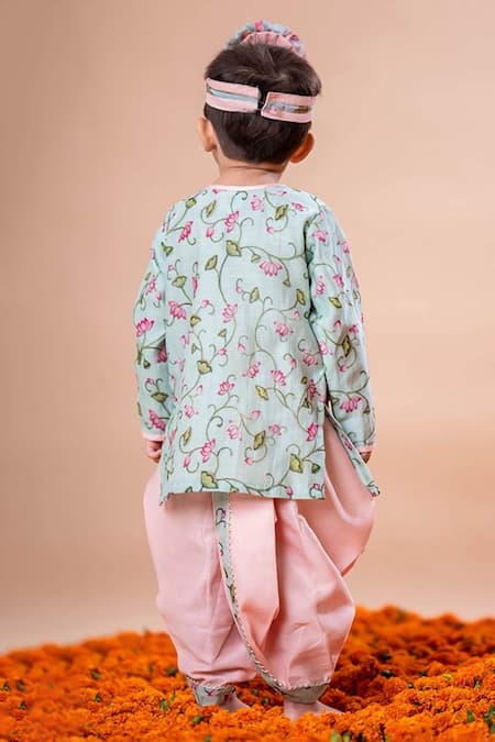 Blue angrakh kurta featuring lotus print with contrast border detailing. Paired with cotton silk dhoti pant and mukut.