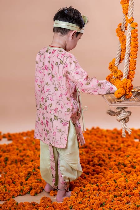 Pink angrakh kurta featuring a lotus print design, complemented by a dhoti pant. Set includes a matching mukut for a complete traditional look.