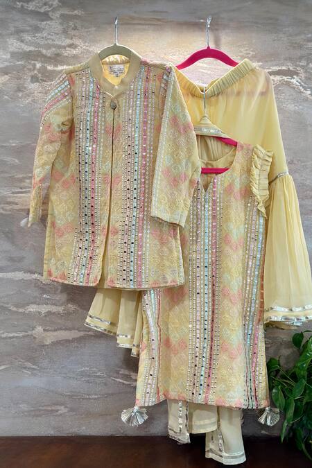 Yellow mirror embroidered kurta featuring ruffled sleeves and a round neckline. Paired with a matching sharara and dupatta, both adorned with embellishments.