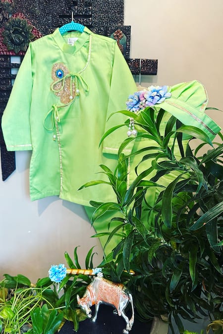 Mint green kurta featuring full sleeves and morpankh beads embroidery with front pearls detail tie-up. Paired with a matching dhoti for a complete look.