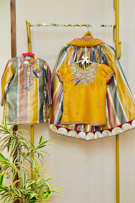 Yellow Silk, Tissue Embroidery Multicolor Striped Lehenga Set