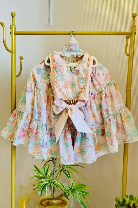 Peach tiered lehenga set featuring floral embroidery. Includes a matching blouse and dupatta.