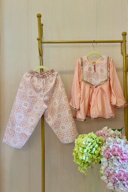 Peach kurta with intricate embroidery and a flared silhouette. Paired with printed pants featuring a decorative pattern.
