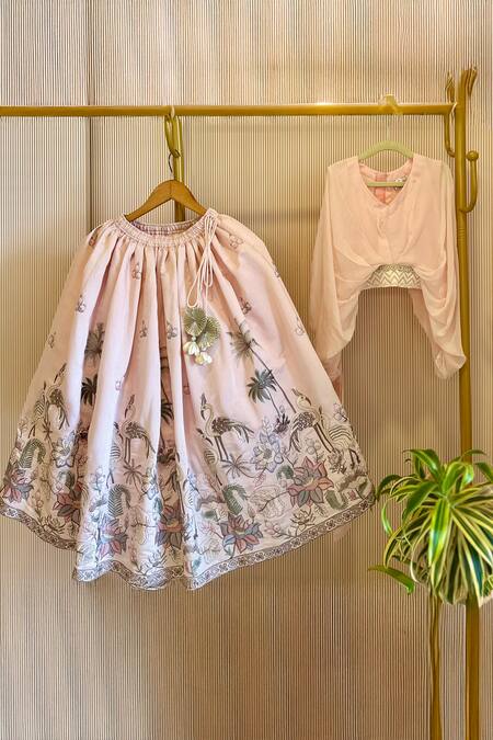 Peach lehenga featuring intricate floral and crane motifs. Paired with a soft organza ruched top for added elegance.