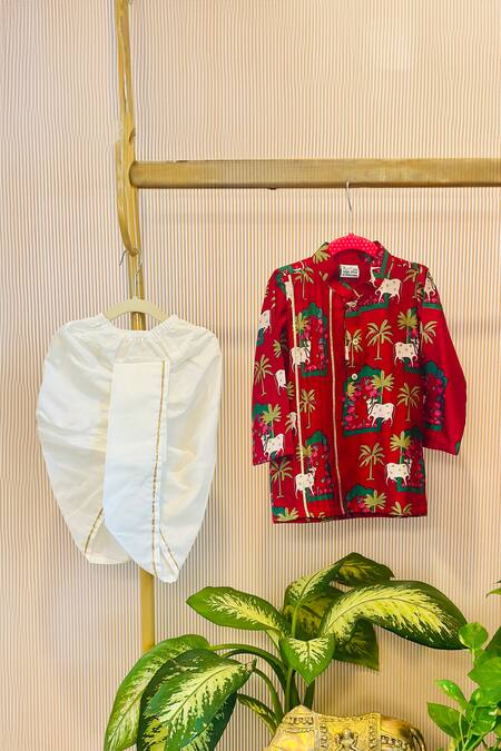 Red Chanderi cotton silk kurta featuring Pichwai print. Paired with a dhoti pant for a complete look.