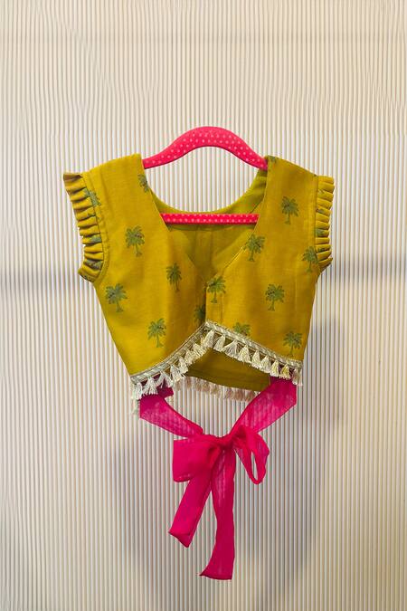 Yellow Chanderi cotton silk lehenga featuring Pichwai print. Paired with a matching blouse adorned with frill sleeves and a pink tie-up detail.