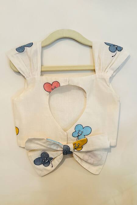 Bow embellished blouse with cut-out back, Thread embroidered floral and butterfly motifs, Attached lining for comfort