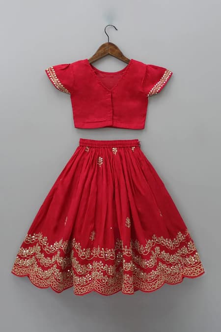 Scalloped hem details on lehenga, Floral tikki embroidery, Dori work highlights