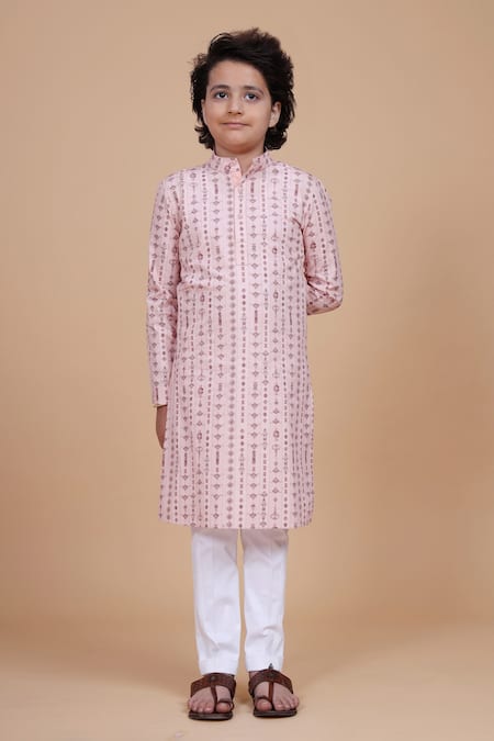 Pink cotton kurta featuring a mandarin collar and full sleeves with floral and linear prints