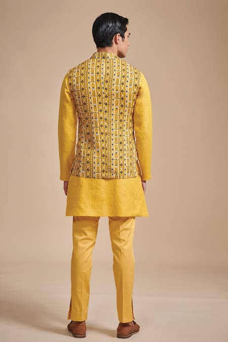 Mustard bundi with all-over geometric print and welt pocket in front. Comes with kurta and tapered pants.