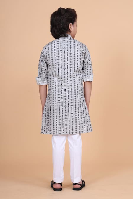 Blue kurta featuring a mandarin collar and three-quarter sleeves with a linear print pattern
