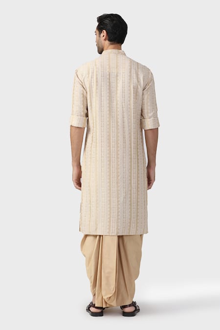 Buy_Raghavendra Rathore Jodhpur_Beige Tussar Sequins, Embroidery Amaryllis Vine Thread Kurta _Online_at_Aza_Fashions