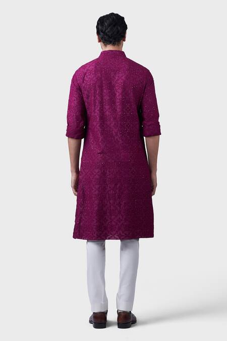 Wine silk kurta featuring rolled up sleeves and all over baroque jaal embroidery with tonal thread work and sequin highlights