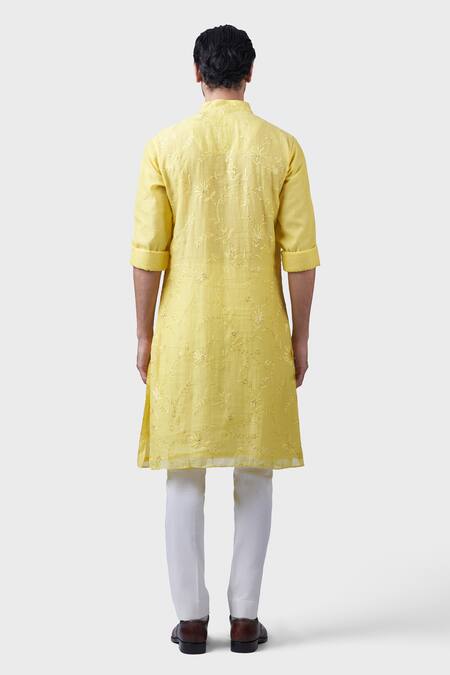 Yellow kurta featuring climbing rose embroidery with tonal thread work, sequin highlights, and stitched lines on rolled-up sleeves