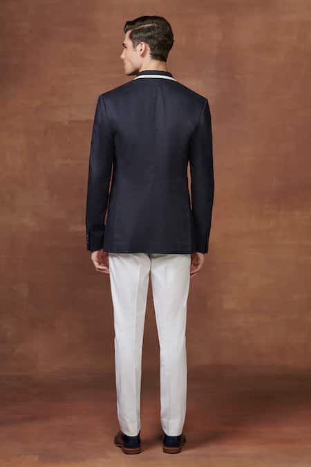 Navy blue tuxedo jacket featuring a lapel collar and full sleeves