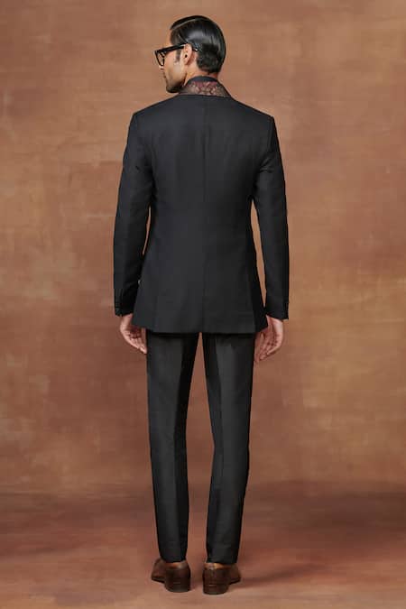Black tuxedo jacket featuring a lapel collar with contrast fabric, two flap pockets, and one patch pocket