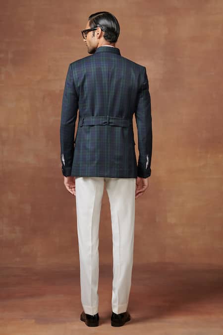Green chequered wool jacket featuring a collared neck and full sleeves