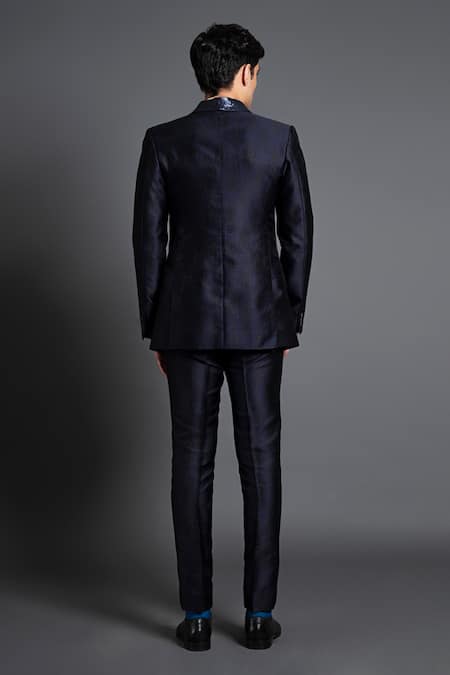 Navy floral brocade tuxedo featuring a glittering shawl collar and flap pockets