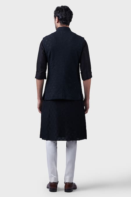 Black silk waistcoat featuring floral embroidery with sequins and thread work
