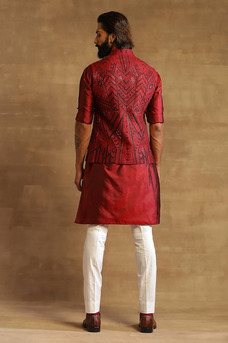 Maroon Raw Silk Geometric Pattern Bandhgala Waistcoat