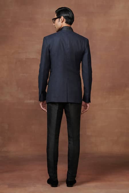 Blue Wool Geometric Woven Overlapped Bandhgala