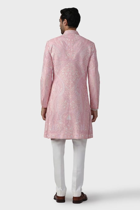 Powder pink achkan featuring all-over hand embroidery with thread, beads, and sequins