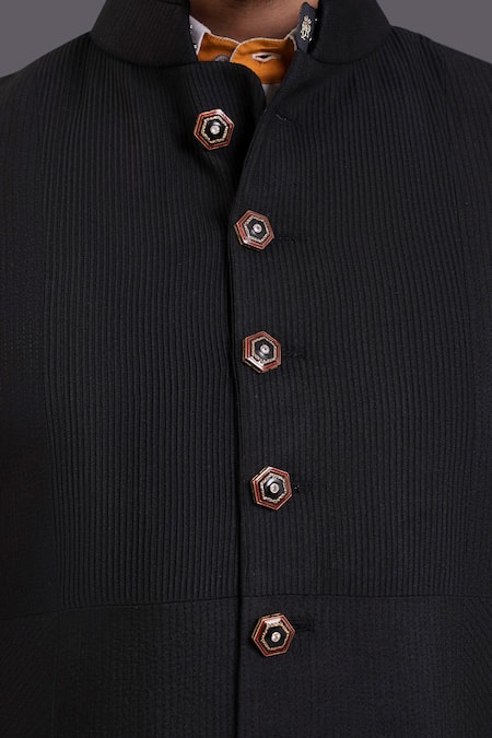 Black bandhgala with pintuck detailing. Paired with white jodhpuri breeches.