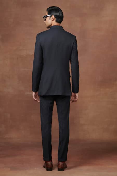 Black wool bandhgala featuring a stand collar and full sleeves. Paired with straight pants for a complete look.