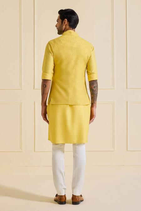 Yellow Nehru jacket featuring a textured pattern and a front pocket. Paired with a coordinating kurta.