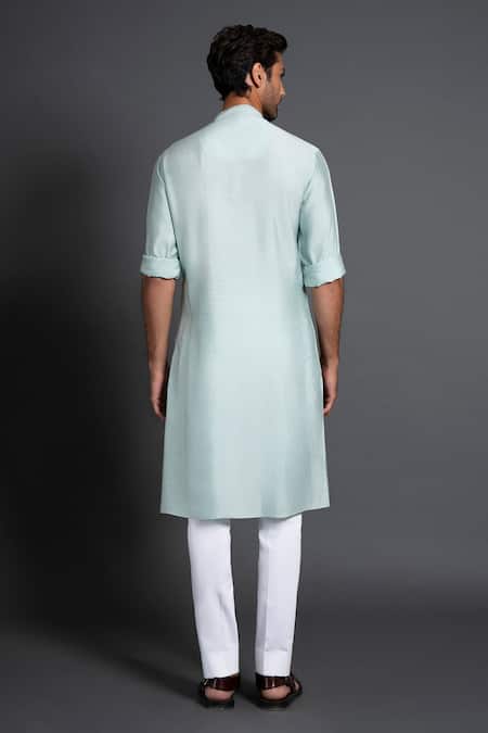Sea green kurta featuring rolled up sleeves and placement embroidery around the placket