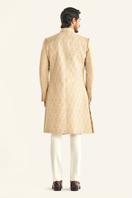 Off white sherwani featuring an all over floral butti pattern and embroidery work