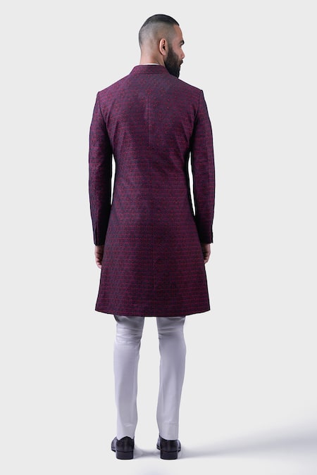 Black silk achkan featuring woven maroon floral scallop patterns and stone buttons