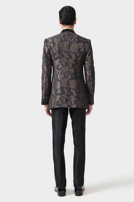 Buy_Raghavendra Rathore Jodhpur_Black Wool, Jacquard Embroidery The Foil Floral Pattern Tuxedo Jacket _at_Aza_Fashions