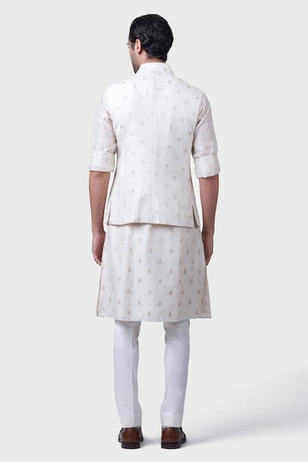Off white waistcoat featuring zari butti embroidery and a stand collar
