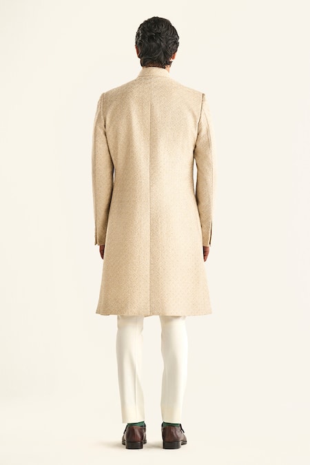 Off white sherwani featuring a stand collar and full sleeves with front button closures
