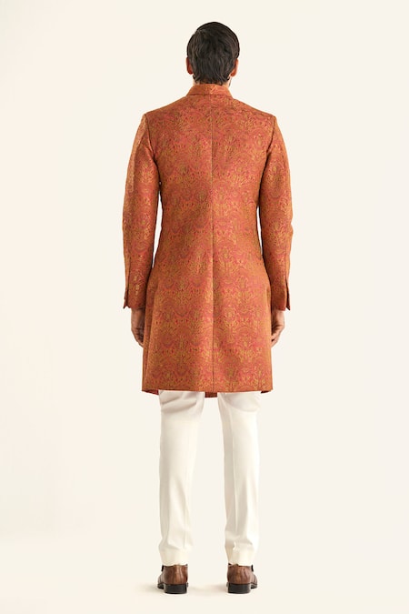 Pink brocade sherwani featuring a floral heritage pattern and front buttons