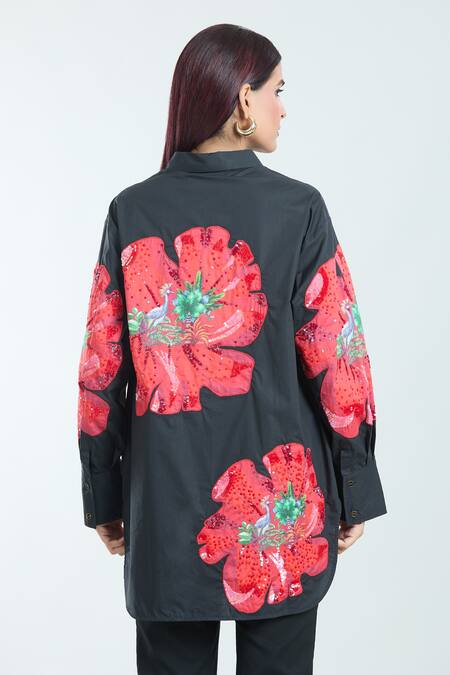 Black shirt featuring full sleeves and a shirt collar with contrasting hibiscus floral embroidery highlighted by sequins
