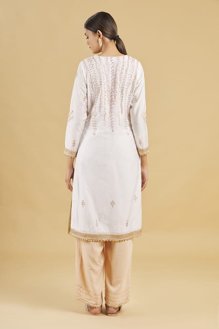 Off white kurta with floral embroidered motifs & lace detail. Paired with lace detailed pant & embroidered net dupatta.