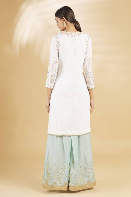 Off white kurta with floral embroidered motifs. Paired with floral embroidered palazzo & net dupatta.