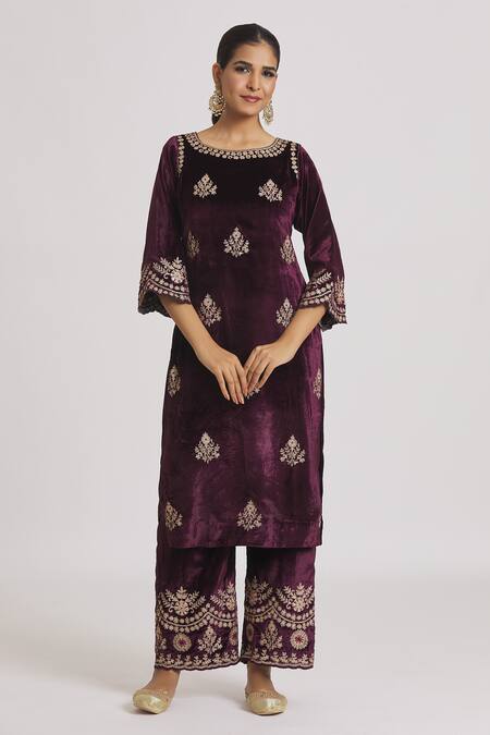 Wine velvet kurta featuring boat neck, bell sleeves, and scalloped cut work hem details. Paired with straight pyjama showcasing embroidered border and half elasticated waistband.