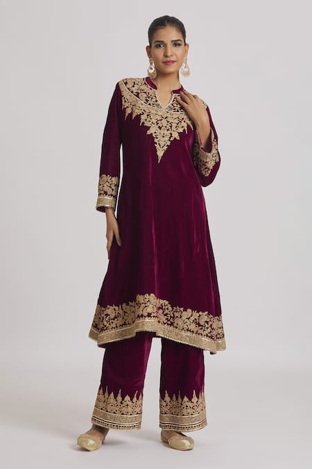 Wine velvet A-line kurta featuring floral embroidery and a notched band neckline. Paired with contrast embroidered hem pyjama, both showcasing a triangular lace hem.