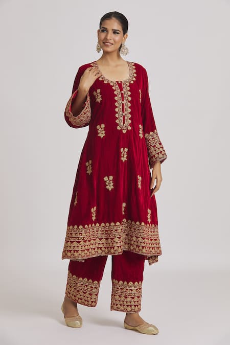Red velvet anarkali featuring bell sleeves, round neckline, and hand embroidery. Paired with a straight pyjama adorned with embroidered border and half elasticated waistband.