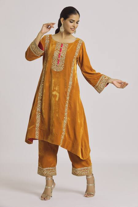 Yellow kurta featuring floral embroidery, round neckline, and three-quarter sleeves. Paired with matching pyjama, both made from velvet fabric.