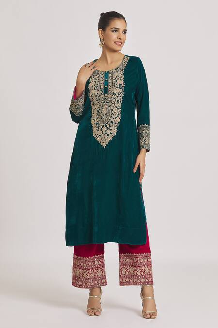 Green velvet kurta featuring contrast floral embroidery on the yoke and sleeve hems. Paired with a matching pyjama adorned with embroidered hems.
