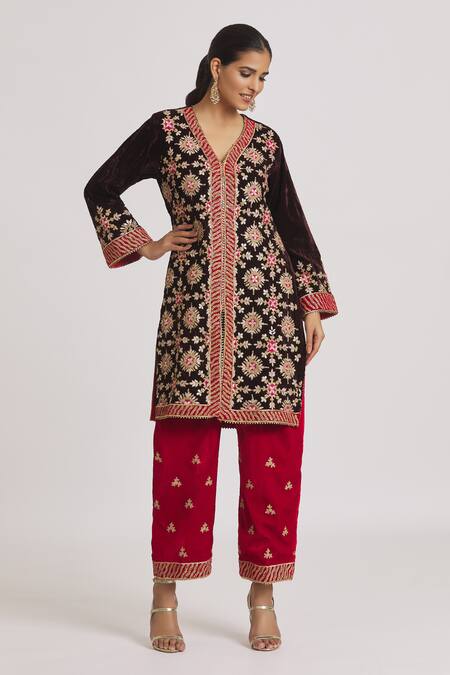 Multi color velvet kurta featuring floral hand and machine embroidery with side slits. Paired with a matching pyjama, this set includes cutwork border detailing and a V neckline.