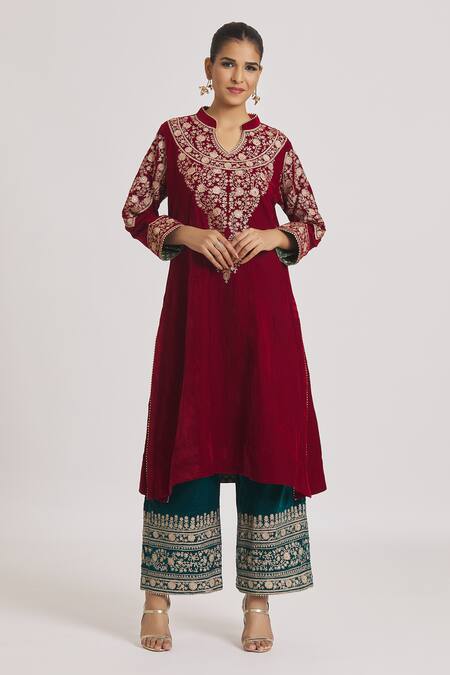 Red velvet kurta featuring contrast floral embroidery on the bodice, back, and sleeves. Paired with contrast pyjama adorned with embroidered hem.